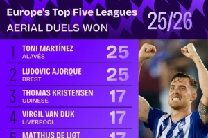 体育资讯9月12日讯 Squawka统计了本赛季球员在五大联赛的争顶成功次数,并列出榜单。 本赛季五大联赛争顶成功排名: 托尼-马丁内斯(阿拉维斯)——25 阿约克(布雷斯特)——25 托马斯-克里斯滕森(乌迪内斯)——17 范迪...