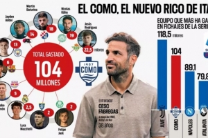 体育资讯8月6日讯 据西媒《阿斯报》发文表示,法布雷加斯执教的科莫今夏已经花费1.04亿欧签下10名新球员,转会支出仅次于尤文,位列意甲第二多。在印尼富豪的支持下,科莫正在成为意甲的一支重要力量。 1907年,球队诞生于科莫湖畔的...