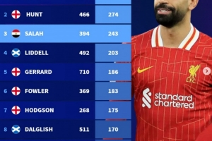 已是传奇!利物浦队史射手榜:拉什居首,萨拉赫第三,杰拉德在列
